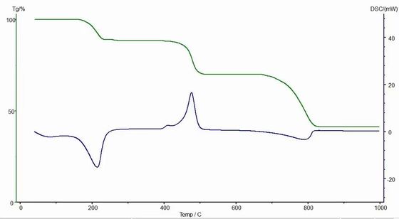 TGA: stabilità termica, decomposizione, ossidazione e riduzione, desorbimento di adsorbimento, acqua libera e contenuto idrico di cristallo, calcolo di rapporto di composizione.